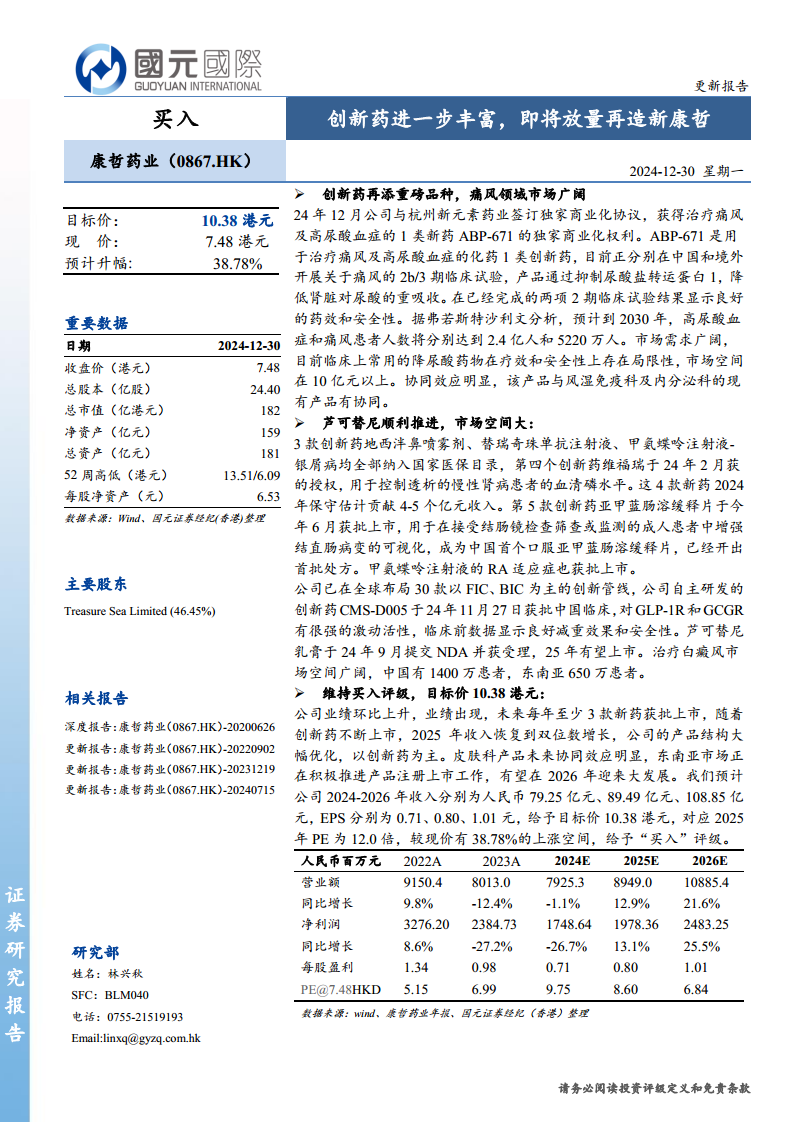 康哲药业(00867):创新药进一步丰富,即将放量再造新康哲
