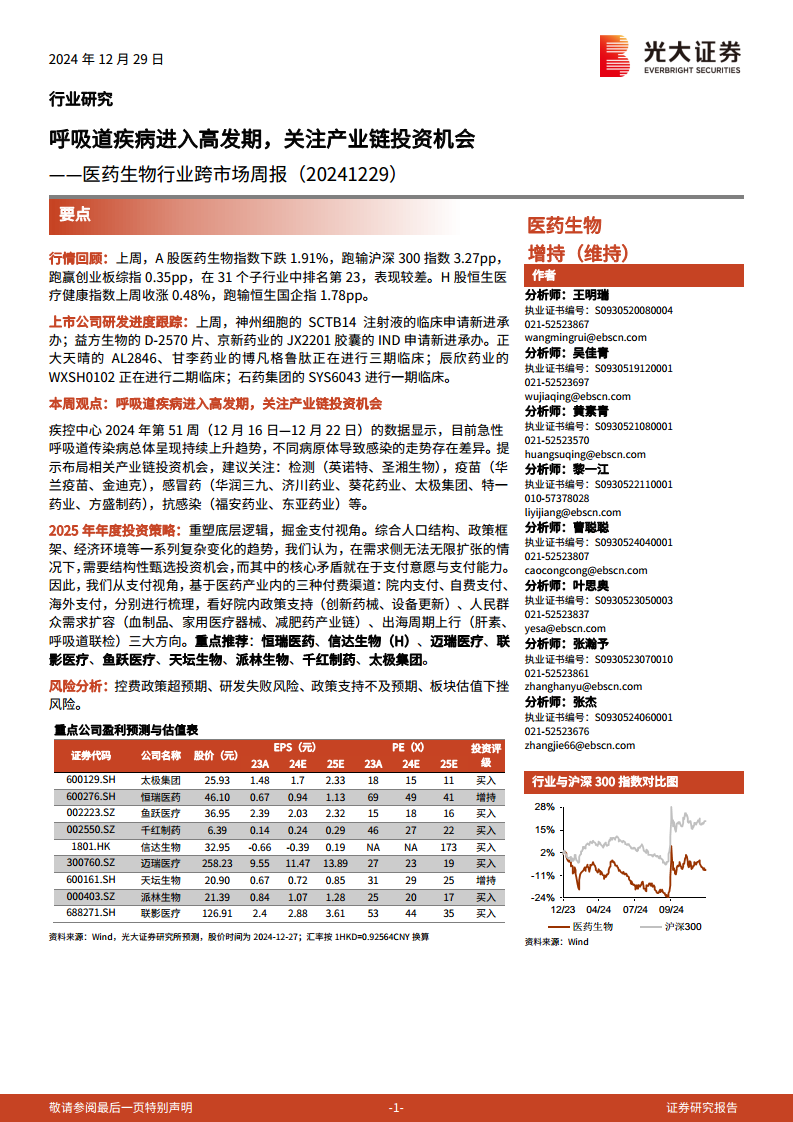 医药生物行业跨市场周报(20241229):呼吸道疾病进入高发期,关注产业链投资机会