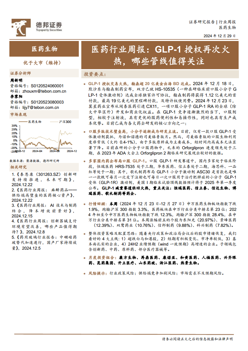 本周(2024年12月23日-12月27日),恒生医疗保健指数上涨0.5%,但较恒生指数跑输1.4%。2024年初至今,恒生医疗保健指数累计下跌19.5%,较恒生指数跑输37.3%。在恒生医疗保健的210支个股中,104支上涨,71支下跌,35支持平。本周涨幅前五的个股为和铂医药(34.3%)、医汇集团(25.7%)、腾盛博药(17.6%)、密迪斯肌(15.4%)、位元堂(15.1%)。跌幅前五的个股为中国卫生集团(-31.5%)、华康生物医学(-17.6%)、万嘉集团(-16.7%)、创胜集团-B(-13.6%)、天大药业(-13.5%)。下周无医药新股上市。