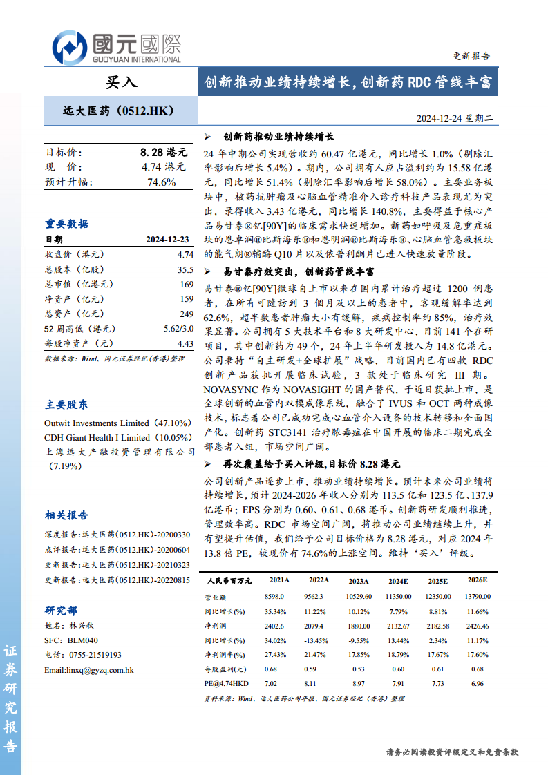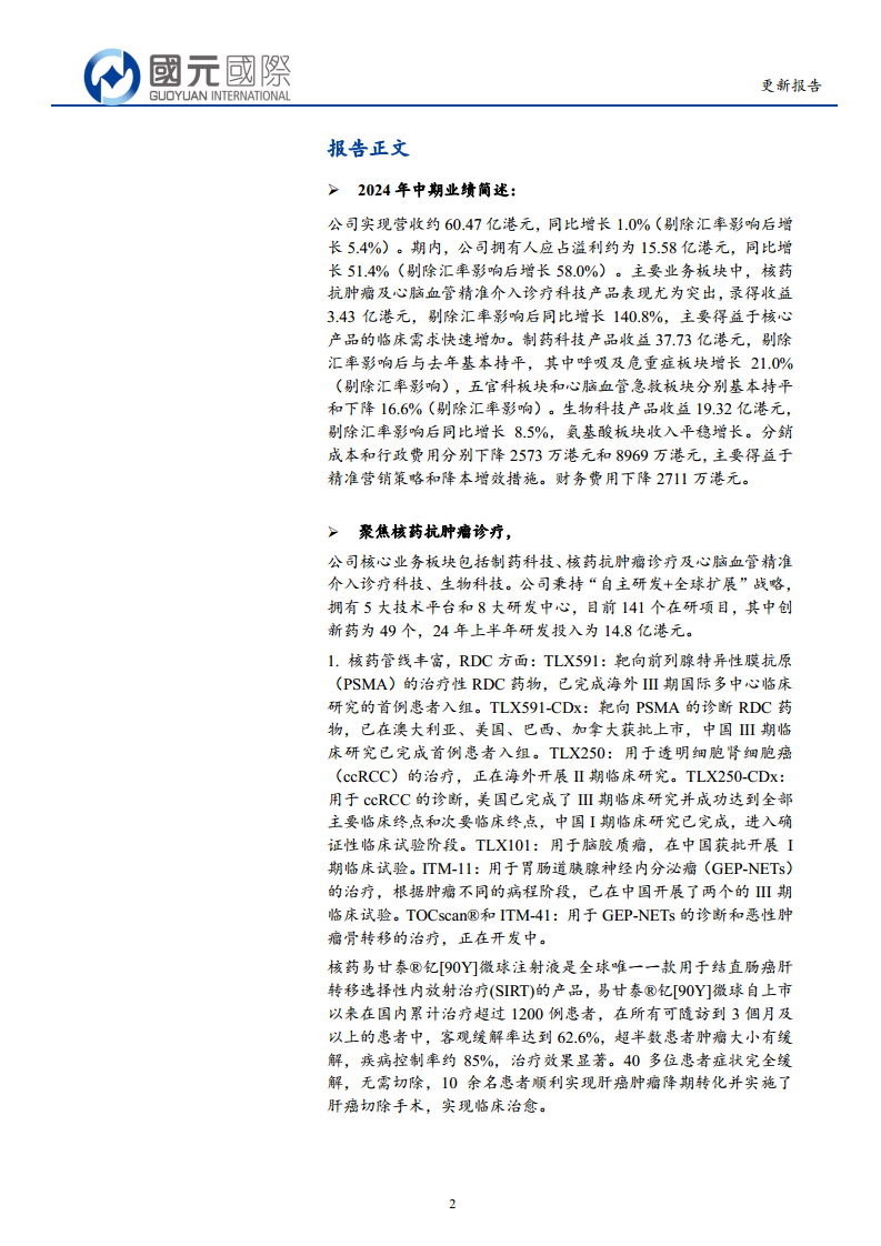 公司在核药RDC、心脑血管介入和制药等多个前沿领域拥有深厚的研发实力和丰富的产品管线,目前在研项目达141个,其中创新药49个,2024年上半年研发投入高达14.8亿港元。多款创新产品已进入临床后期或获批上市,如易甘泰®钇[90Y]微球、NOVASYNC等,这些高潜力产品的商业化进程加速,以及RDC等广阔市场的持续拓展,将为公司未来业绩增长奠定坚实基础,并有望持续提升公司估值。