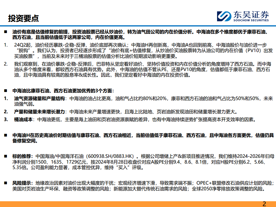 本报告核心观点指出,随着油价底部得到确认,石油股票的投资逻辑已从短期油价波动转向油气公司内在价值分析。在此背景下,中国海洋石油(中海油)在多个关键维度上均优于康菲石油和西方石油,包括油气资源结构、产量增长潜力、桶油成本控制、盈利能力、分红回购政策以及自由现金流表现。尽管中海油展现出卓越的内在价值和成长性,其当前估值(无论是PE、PV10还是EV/EBITDA)仍低于康菲石油和西方石油,预示着显著的估值修复空间。因此,报告坚定看好中海油的内在投资价值,并维持“买入”评级。