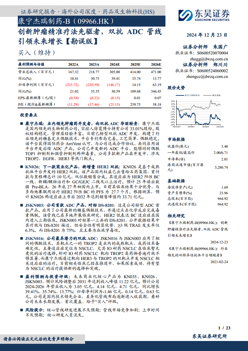 康宁杰瑞制药-B(09966):创新肿瘤精准疗法先驱者,双抗ADC管线引领未来增长勘误版