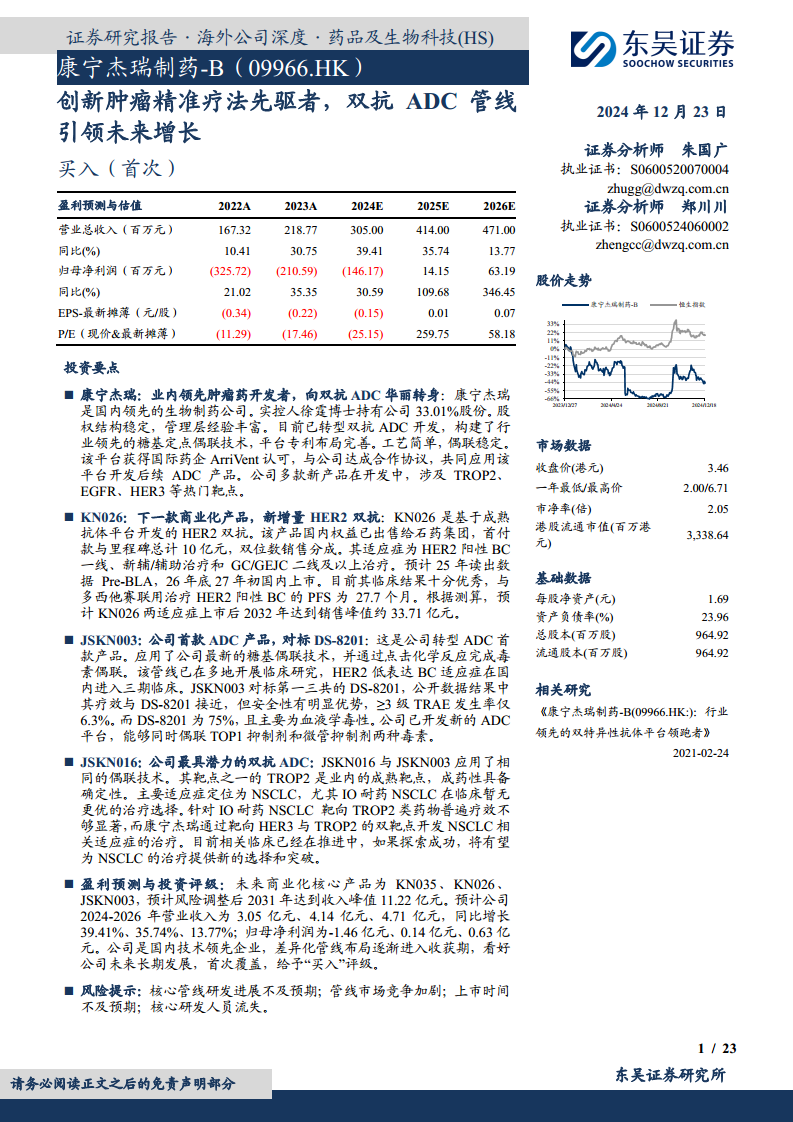 由于公司仍处于管线产品兑现初期,目前处于亏损阶段,预计2025年能够盈利,因此采用市销率(P/S)进行估值。康宁杰瑞2024-2026年市销率分别为10/7/7,可比公司(康方生物、科伦博泰、信达生物)市销率均值为16/13/9。鉴于康宁杰瑞作为国内双抗技术领先企业,专注于创新肿瘤疗法开发,抗体技术平台能力已得到商业化验证,差异化管线布局逐渐进入收获期,东吴证券首次覆盖并给予“买入”评级。