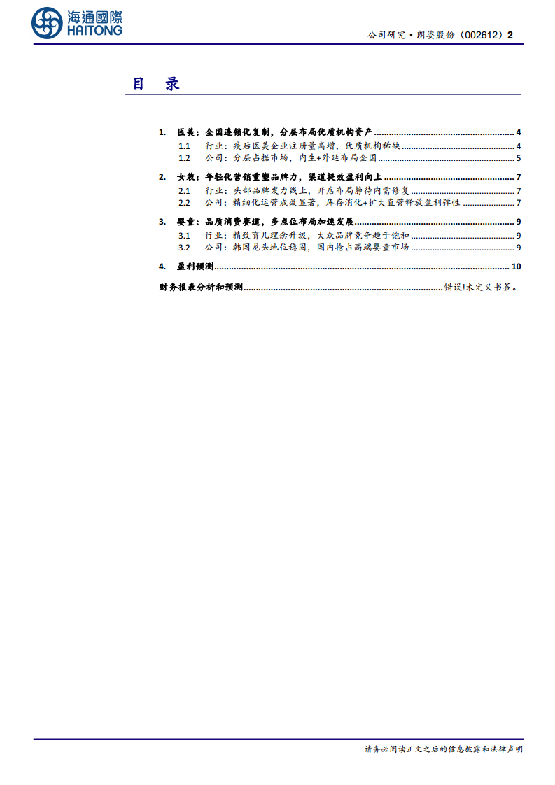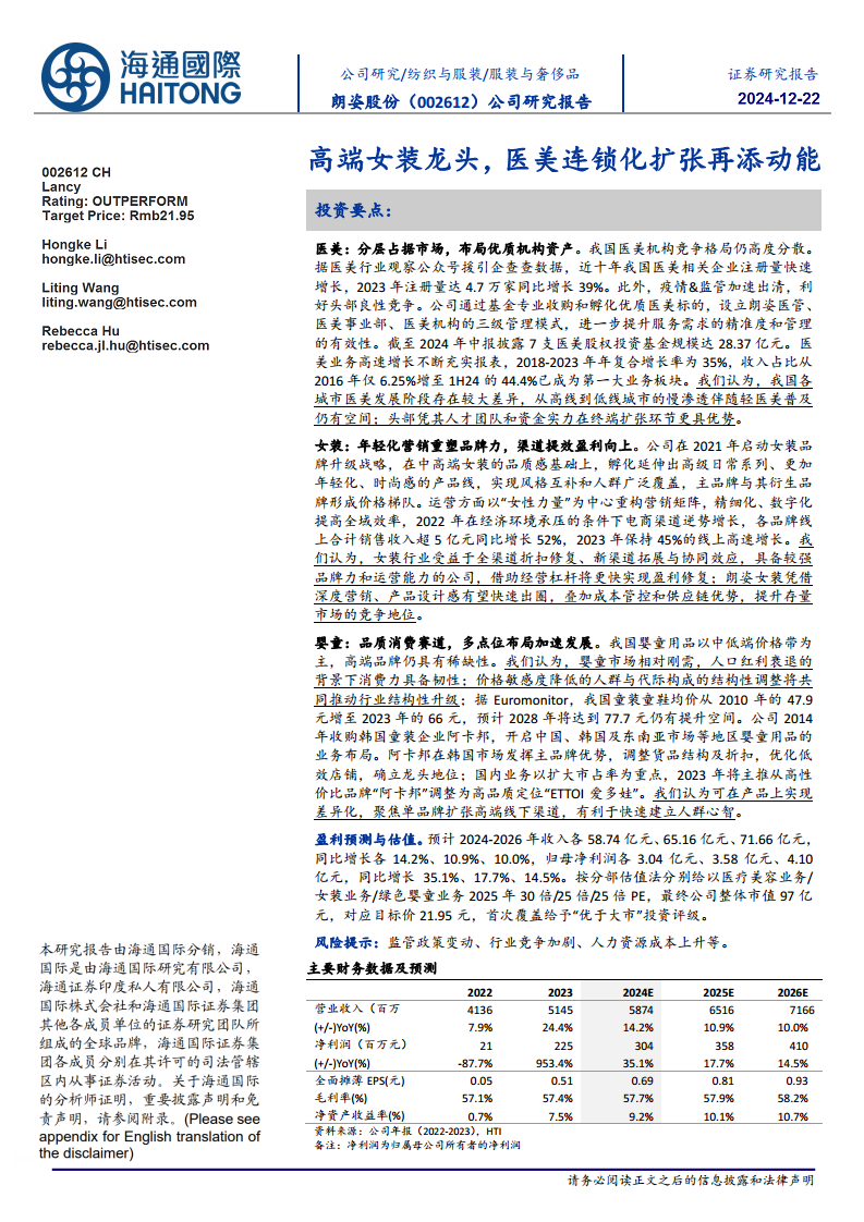 - 多业务协同驱动,盈利能力持续优化: 朗姿股份凭借对时尚领域的深刻理解和把握,通过多品牌运作策略实现了从产品型企业向集团管控型企业的过渡。公司资本运作模式成熟高效,随着线上线下渠道的进一步打通,集团中台专业化和数据化能力的升级将赋能产品运营,预计女装基本盘稳固,医美及婴童业务将带来高成长性,从而实现持续增长和盈利优化。
