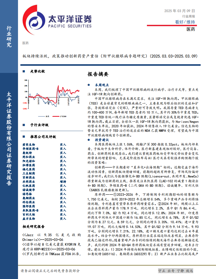 本周医药板块整体表现活跃,但略跑输沪深300指数。报告核心观点指出,政策因素正推动创新药资产的重估,特别是在甲状腺眼病(TED)治疗领域,IGF-1R靶向创新药展现出巨大的未满足市场需求和增长潜力。同时,宏观经济政策(如美联储降息周期开启、中国经济刺激计划)和行业政策(如集采深化、MAH制度收紧)共同作用,为医药各子板块带来了结构性投资机遇。
