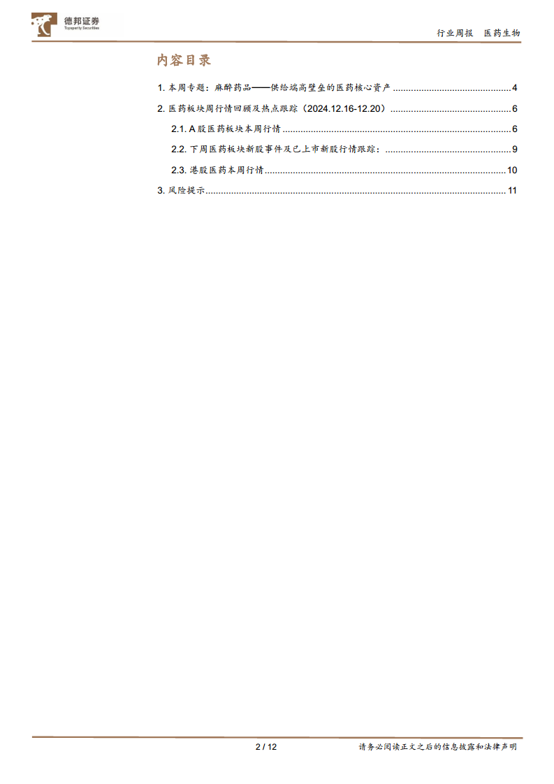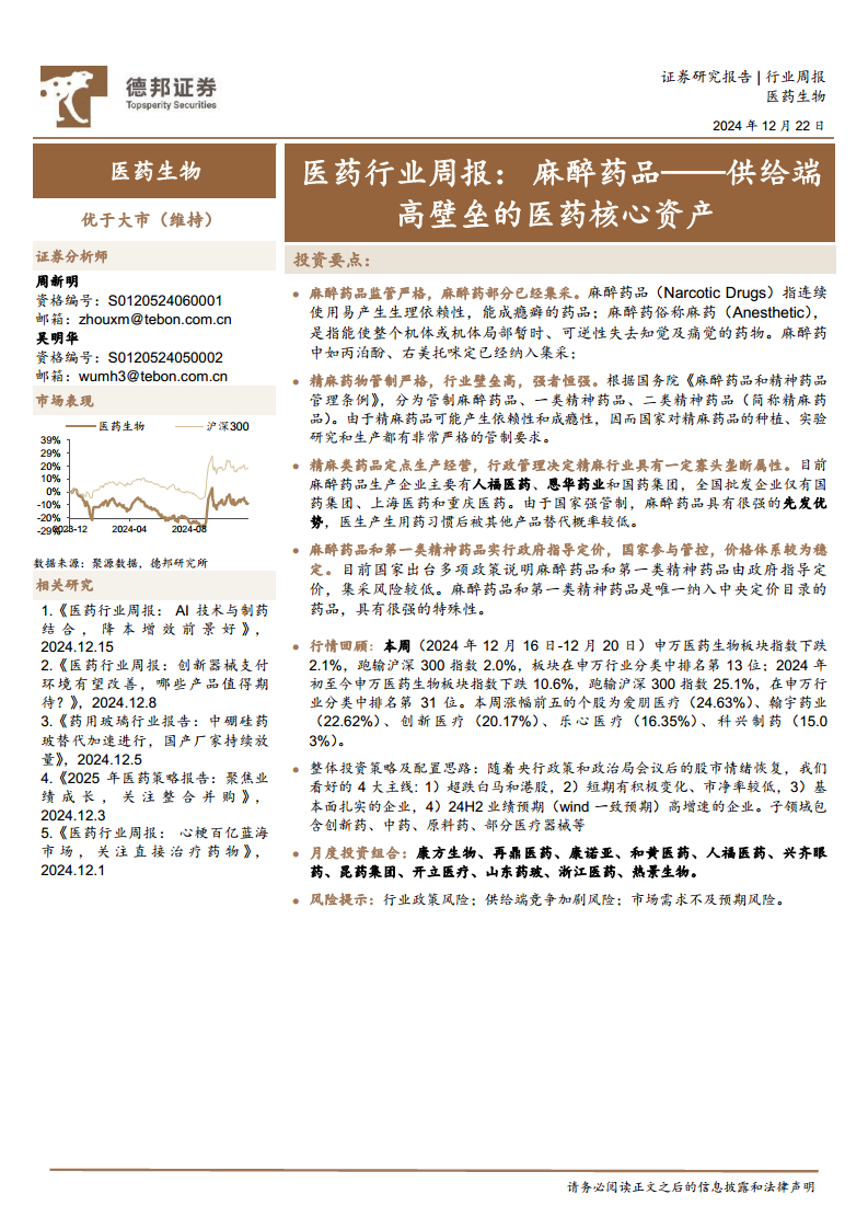 报告最后提示了行业政策风险、供给端竞争加剧风险以及市场需求不及预期风险,建议投资者在把握麻醉药品等高壁垒核心资产机遇的同时,密切关注宏观经济环境和行业政策变化。