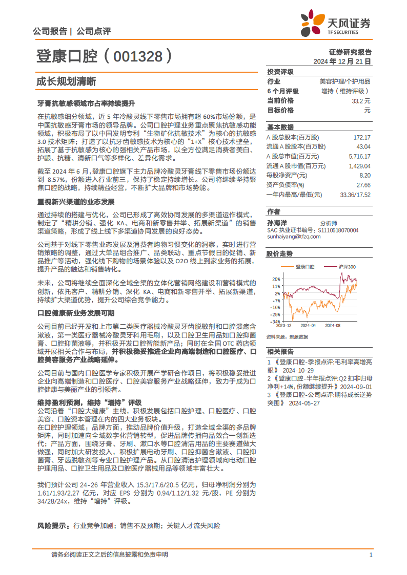 登康口腔凭借其在抗敏感牙膏市场的领导地位和持续增长的市场份额,展现出强大的核心竞争力。公司通过深化多渠道营销网络建设和创新营销模式,有效提升了市场触达和销售转化。同时,公司积极布局口腔医疗器械、口腔卫生用品等新业务,并沿着“口腔大健康”主线进行战略延伸,致力于成为口腔健康与美丽产业的引领者,为未来的可持续增长奠定坚实基础。尽管面临行业竞争和销售风险,但其清晰的成长规划和稳健的财务预测,支持了“增持”的投资评级。