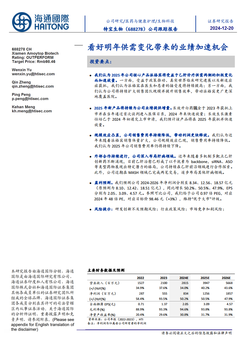 特宝生物在2025年有望迎来业绩加速增长,主要得益于核心产品派格宾在乙肝诊疗市场供需两端的积极变化。政策支持、真实世界临床研究的积极进展以及新适应症的获批将显著提升派格宾的市场接受度和渗透率。同时,公司通过扩大销售团队和提升效率,进一步巩固市场覆盖。新产品珮金和怡培的快速放量将为公司业绩提供额外增量,而规模效应的显现将持续优化销售费用率,推动利润更快释放。此外,公司在乙肝前沿领域和MASH领域的战略性外部合作,预示着其在肝病治疗领域的长期布局和多元化发展潜力。综合来看,特宝生物展现出强劲的增长势头和盈利能力,维持“优于大市”评级。