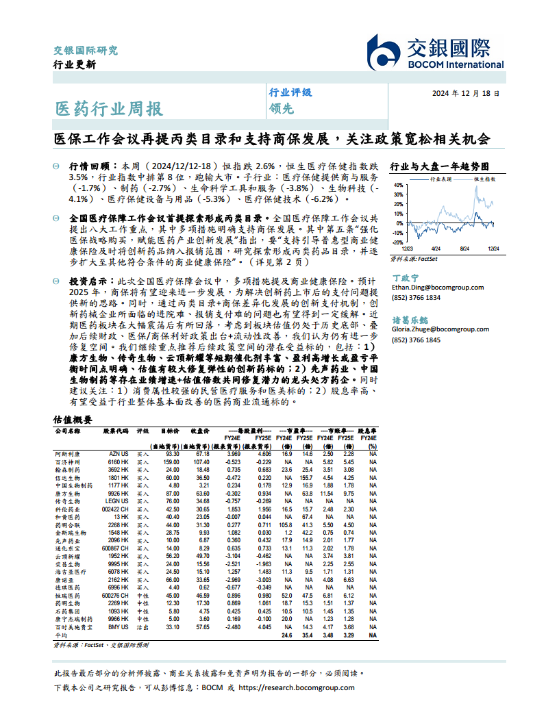 - 本周(2024/12/12-18)恒生指数下跌2.6%,恒生医疗保健指数下跌3.5%,在12个行业指数中排名第8位,跑输大市。