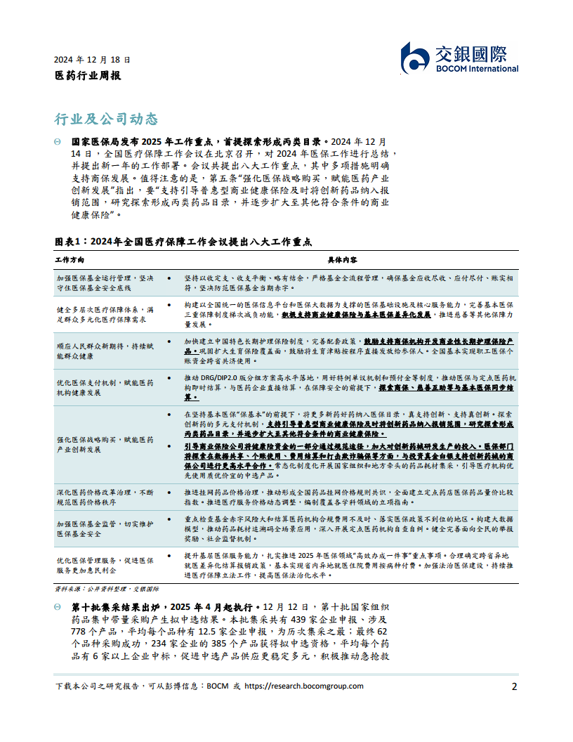 - 会议共提出八大工作重点,其中多项措施旨在强化医保战略购买,赋能医药产业创新发展,包括引导商业保险公司将健康险资金的一部分通过规范途径,加大对创新药械研发生产的投入。医保部门将探索在数据共享、个账使用、费用结算和打击欺诈骗保等方面,与投资真金白银支持创新药械的商保公司进行更高水平合作。