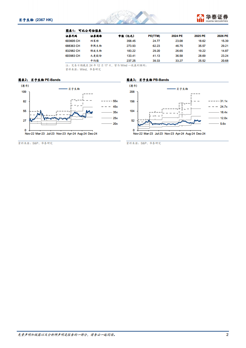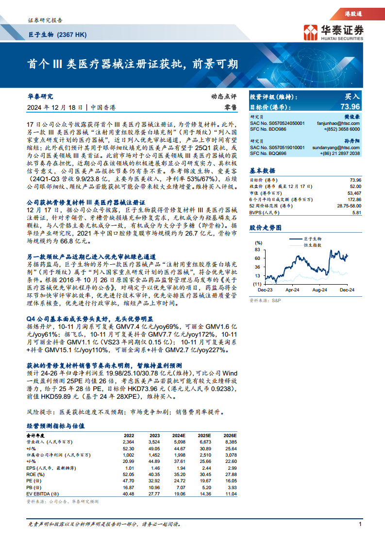 华泰研究维持对巨子生物2024-2026年的盈利预测,预计归母净利润分别为19.98亿元、25.10亿元和30.78亿元。考虑到公司在医美领域III类医疗器械产品获批后可能带来的巨大业绩释放潜力,研究报告给予公司2025年28倍的市盈率(PE),高于可比公司Wind一致盈利预测的平均26倍PE。基于此,目标价上调至73.96港币(前值为59.89港币),维持“买入”评级。这反映了市场对公司未来增长前景的积极预期。