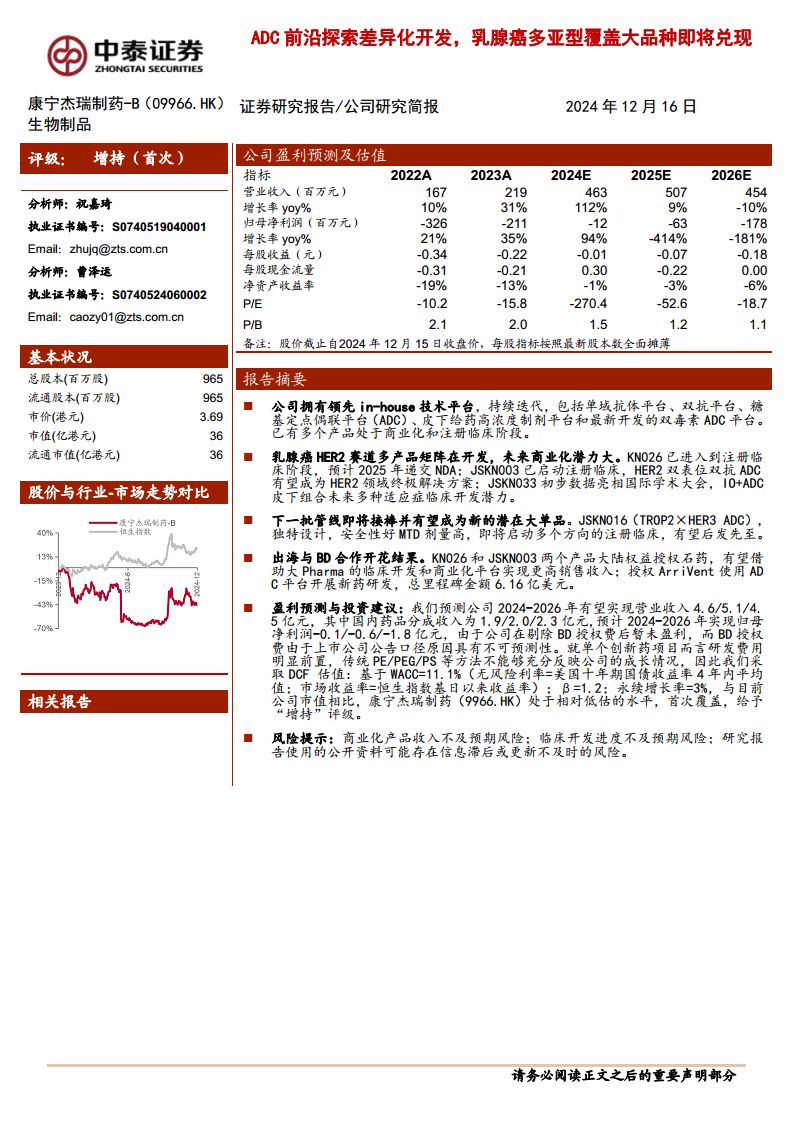 KN026和JSKN003等核心产品已进入注册临床或NDA阶段,并已通过与石药集团的BD合作实现商业化布局,有望在未来几年内兑现巨大的市场价值。公司盈利能力预计将逐步改善,尽管短期内受研发投入影响仍处于亏损,但DCF估值显示其目前股价被低估,首次覆盖给予“增持”评级。