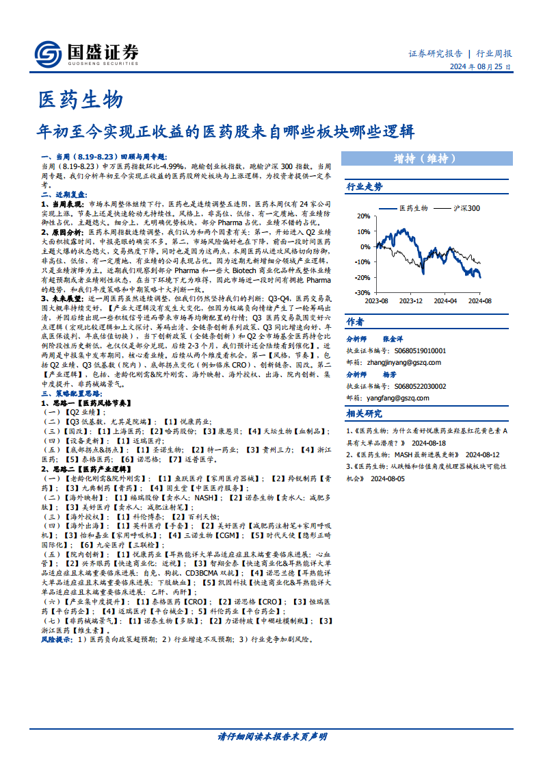 年初至今实现正收益的医药股来自哪些板块哪些逻辑