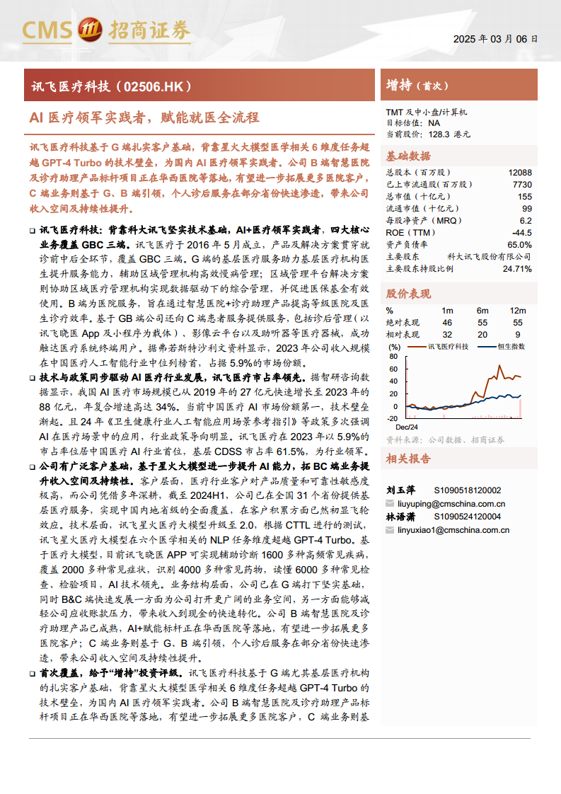 讯飞医疗科技(02506.HK)作为中国AI医疗领域的领军实践者,凭借其在G端(政府及基层医疗机构)的深厚客户基础和科大讯飞“星火大模型”的强大技术支持,正积极拓展B端(医院)和C端(患者)业务,以实现收入结构优化和持续性增长。公司在2023年中国医疗人工智能市场中占据5.9%的市场份额,位列榜首,并在基层CDSS(临床决策支持系统)市场拥有61.5%的领先份额。通过四大核心业务覆盖就医全流程,讯飞医疗不仅提升了医疗服务效率和质量,也受益于中国AI医疗市场的高速增长和明确的政策导向。