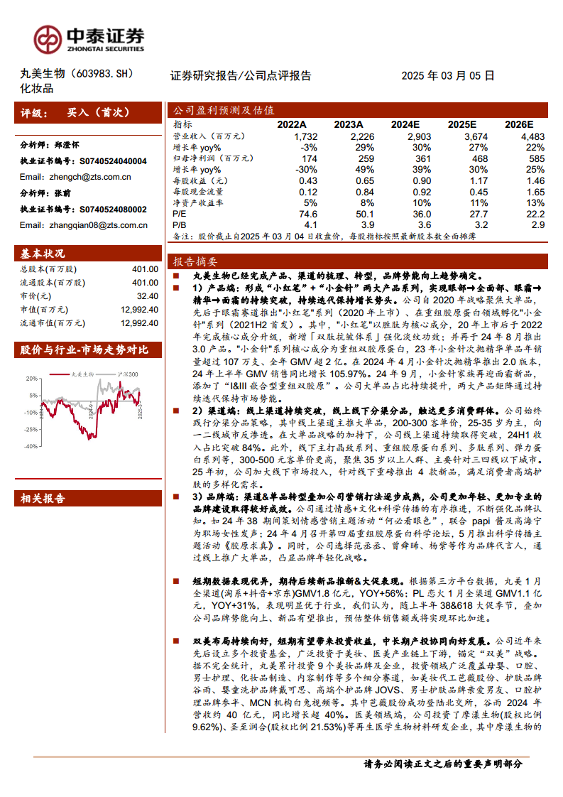 丸美生物通过成功实施“大单品”战略,并结合线上线下渠道的精细化运营和成熟的品牌营销,实现了核心业务的显著增长和品牌势能的持续提升。同时,公司积极布局“双美”战略,通过产业基金投资美妆和医美产业链上下游,不仅带来了可观的投资收益,更构建了产投协同的多元化增长模式。鉴于公司强劲的财务增长预测、大单品业务的上升空间以及“双美”战略的协同效应,丸美生物展现出良好的投资价值。