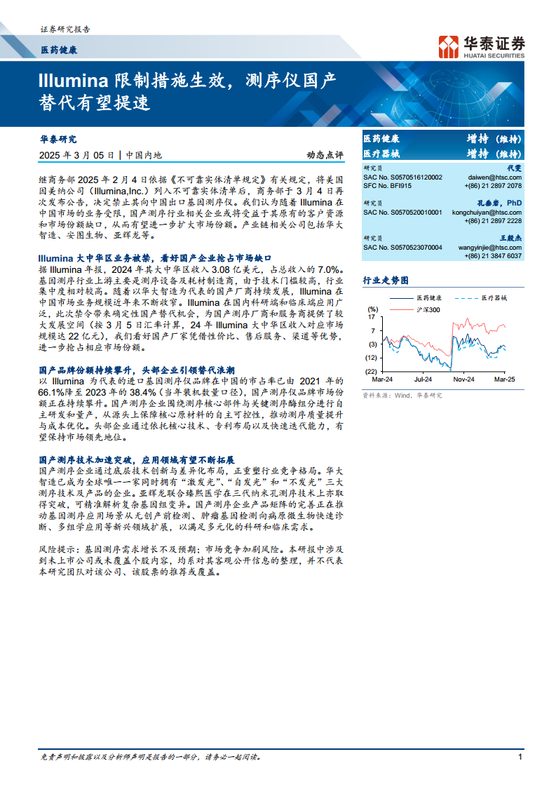 美国商务部对Illumina的出口限制措施,为中国基因测序仪市场带来了明确的国产替代机遇。在政策驱动和技术创新的双重作用下,国产测序企业正加速崛起,市场份额持续攀升。华大智造、安图生物、亚辉龙等头部企业凭借其在技术、产品和市场布局上的优势,有望充分受益于此次市场格局重塑,抢占Illumina留下的市场空白,并进一步拓展基因测序的应用领域。然而,行业发展仍需关注基因测序需求增长不及预期以及市场竞争加剧的风险。