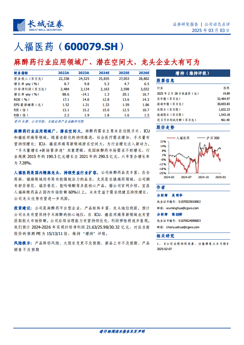 本报告深入分析了麻醉药行业的广阔应用前景和巨大潜在空间,指出人口老龄化、手术量增长以及ICU和癌症疼痛等术外应用场景的拓展是行业增长的核心驱动力。我国麻醉药市场规模从2015年的190.3亿元增长至2021年的290.5亿元,六年复合增长率达7.28%。人福医药作为国内麻醉药领域的龙头企业,凭借其丰富的产品线和超过60%的市场份额,有望在行业扩容和新场景渗透中持续受益,进一步巩固其市场领导地位。报告维持对人福医药的“增持”评级,并预测其2024-2026年归母净利润将实现稳健增长,分别为21.63亿元、25.98亿元和30.32亿元。同时,报告也提示了产品降价、大股东变更不及预期、新品上市不及预期和产品销售不及预期等风险。