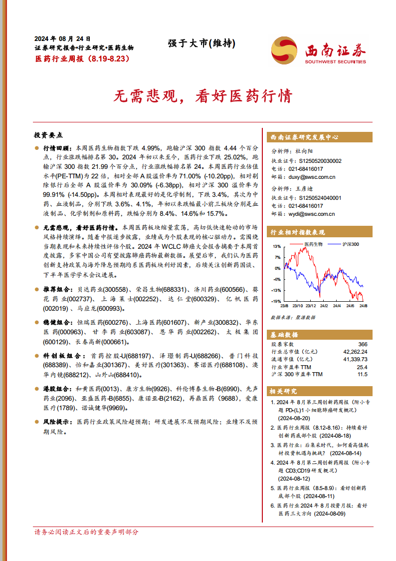 本报告深入分析了2024年8月19日至8月23日期间医药生物行业的市场表现、投资策略及最新动态。核心观点指出,尽管医药生物指数在本周及年初至今均跑输大盘,行业整体估值水平有所下降,但无需对医药行情感到悲观。随着中期报告的逐步披露,业绩成为驱动个股表现的核心因素。展望后市,医药创新支持政策的持续推进以及海外降息预期的升温,均被视为医药板块的利好因素。报告强调,应围绕当期业绩和未来持续性评估个股,并重点关注创新药国家医保谈判和下半年医学学术会议的进展。