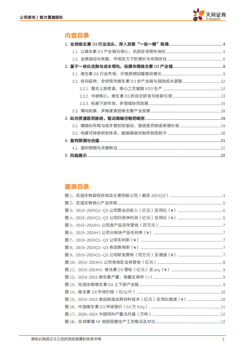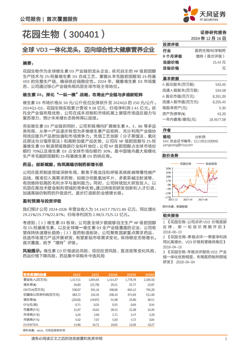花园生物作为全球维生素D3产业链的龙头企业,凭借其独特的全产业链一体化优势和核心技术,在NF级胆固醇和维生素D3市场占据主导地位。公司积极推行“一纵一横”发展战略,在巩固维生素D3核心业务的同时,横向拓展多元维生素产品,并深耕高端仿制药领域。尽管2023年受市场价格低迷影响业绩波动,但2024年第三季度已展现强劲复苏态势,得益于维生素D3价格回暖、成本控制优化及医药板块的稳健增长。公司持续加大研发投入,构建可持续研发体系,为未来业绩增长奠定坚实基础。预计未来公司营收和归母净利润将保持快速增长,但需关注维生素D3价格波动、项目投资、医改政策变化、药品价格下降及集中采购未中选等风险。