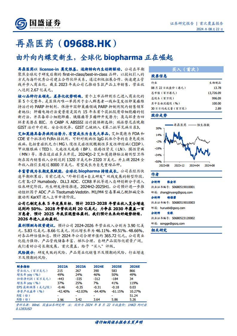 再鼎医药(09688):由外向内蝶变新生,全球化biopharma正在崛起