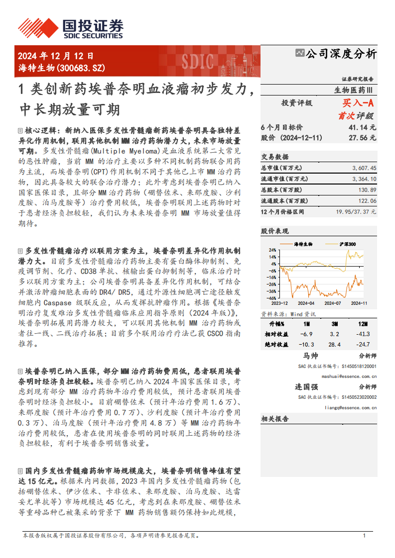 海特生物凭借其1类创新药埃普奈明在多发性骨髓瘤治疗领域的独特作用机制、优异的临床数据和成功纳入国家医保目录,展现出巨大的市场潜力和增长空间。埃普奈明差异化的作用机制使其在联合用药方面具有广阔前景,且与现有低成本药物联用可减轻患者经济负担,有利于市场渗透。报告预计埃普奈明销售峰值有望达到15亿元,将驱动公司实现营收和利润的显著增长,扭转当前亏损局面。基于DCF估值模型,公司价值约为54亿元,首次获得“买入-A”的投资评级,目标价41.14元。尽管存在创新药进院、销售放量及后续临床进度不及预期的风险,但埃普奈明的核心竞争力及其在庞大多发性骨髓瘤市场中的战略地位,使其成为值得关注的投资标的。