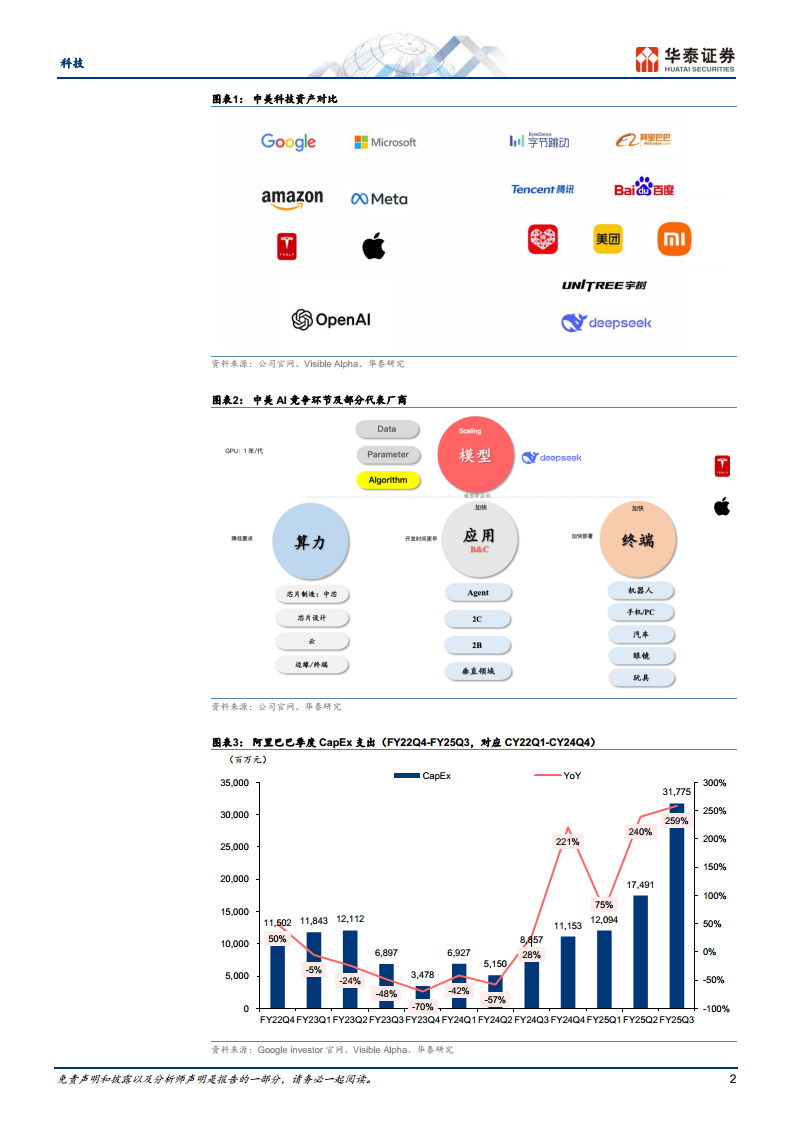 本报告核心观点指出,中国AI产业已告别单纯对标美股的“映射”阶段,正凭借强劲的资本开支、模型能力的突破以及应用商业化的加速,步入一个全新的上行周期。以阿里巴巴FY2025Q3季度资本开支同比+259%的显著增长为代表,大厂对AI基础设施的投入成为中国AI进入新阶段的有力印证。