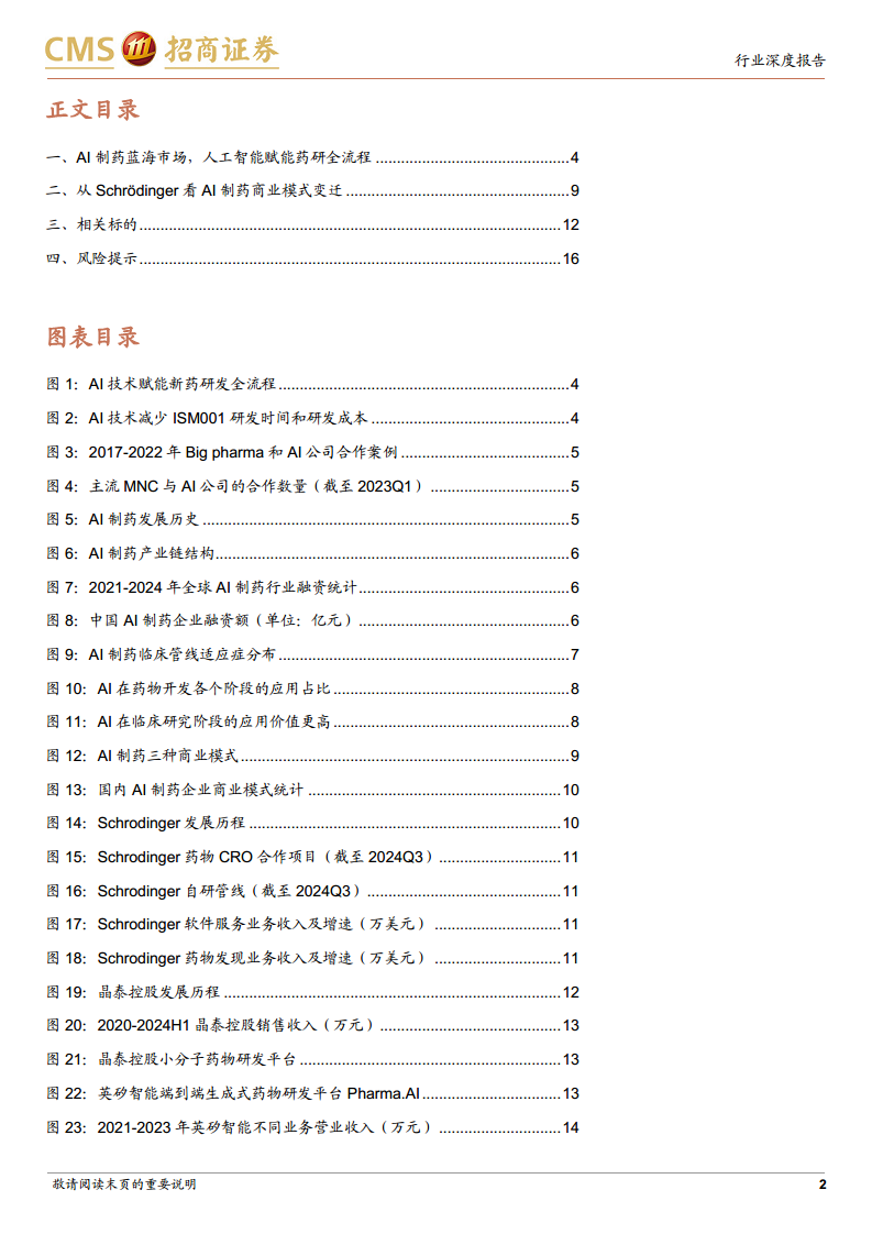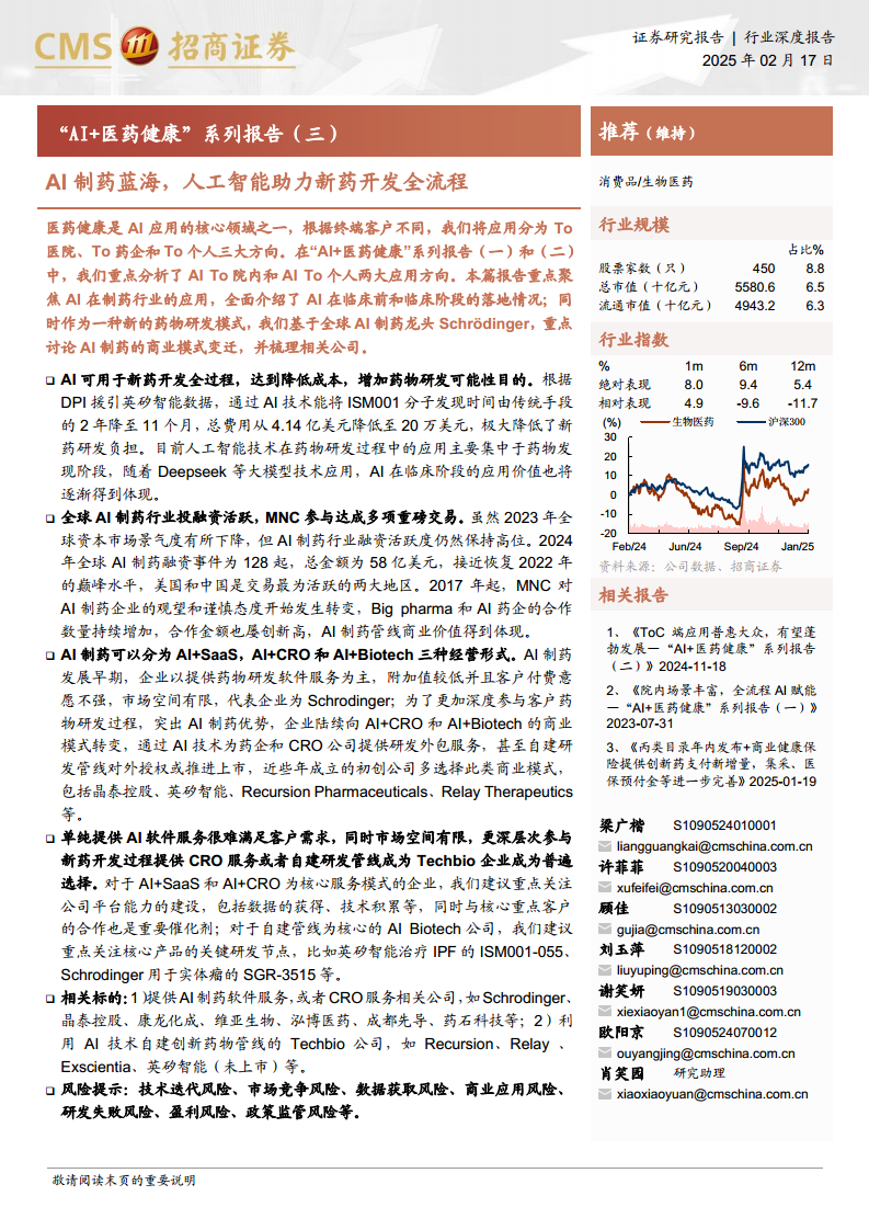 本报告深入剖析了“AI+医药健康”领域中AI制药的广阔前景与发展现状。人工智能技术正通过显著缩短新药研发周期、大幅降低成本并提高研发成功率,为传统制药行业带来革命性变革。全球AI制药市场投融资活跃,跨国药企积极参与合作,共同推动AI制药管线的商业价值实现。AI制药的商业模式正从单一的软件服务向更深度的研发参与和自主研发管线演进,以Schrödinger为代表的行业领导者已成功实现多业务协同发展。晶泰控股、英矽智能、维亚生物、成都先导和泓博医药等公司,通过各自独特的AI技术平台和商业模式,在药物发现、优化及临床开发等环节发挥着关键作用。尽管AI制药行业仍处于早期阶段,面临技术迭代、市场竞争、数据获取、商业应用、研发失败、盈利和政策监管等多重风险,但其在提升药物研发效率方面的巨大潜力已得到验证,有望为突破创新药开发的“反摩尔定律”提供可能性。