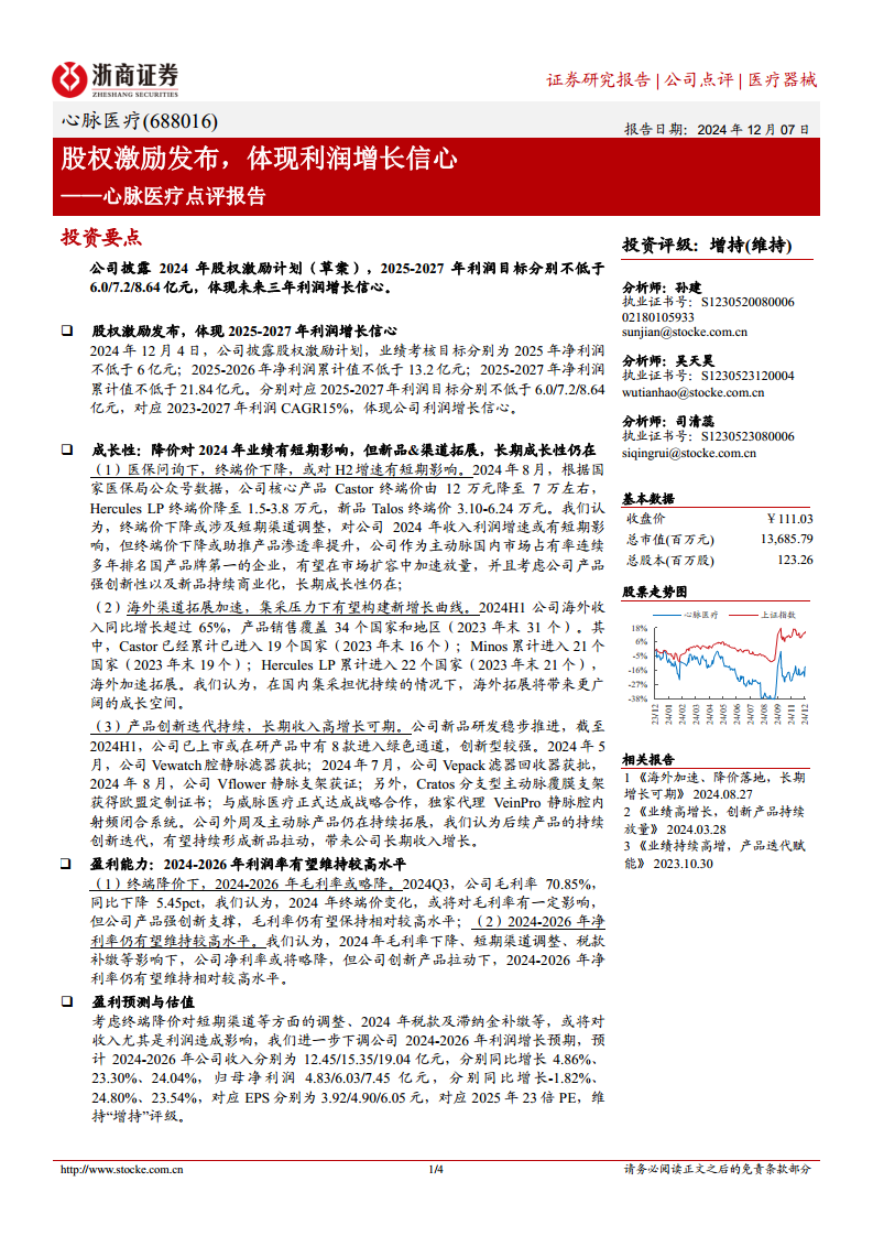 心脉医疗通过发布股权激励计划,明确了未来三年(2025-2027年)的利润增长目标,展现了公司对业绩增长的坚定信心。尽管短期内终端产品价格下降可能对2024年业绩造成一定压力,但公司凭借其持续的产品创新、加速的海外市场拓展以及在主动脉领域的领先地位,有望在市场扩容中实现快速增长,并构建新的业绩增长点。虽然盈利预测有所下调,但公司长期成长性依然存在,预计利润率将维持在较高水平。基于对公司未来增长潜力的分析,本报告维持“增持”评级。