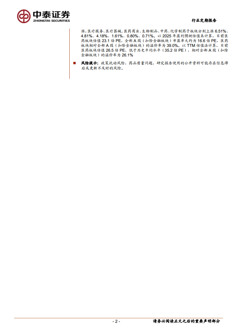 本报告提示投资者关注以下风险:政策扰动风险、药品质量问题,以及研究报告使用的公开资料可能存在信息滞后或更新不及时的风险。
