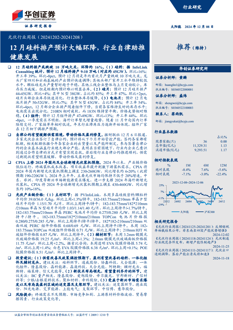 光伏行业周报(20241202-20241208):12月硅料排产预计大幅环降,行业自律助推健康发展