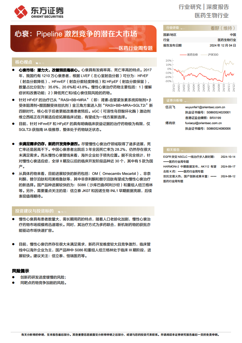 投资建议方面,鉴于心衰市场的巨大潜力、未满足需求以及新药研发的持续投入,建议关注在心衰创新药领域具有领先布局的信立泰和恒瑞医药等企业。同时,报告也提示了创新药研发进度缓慢和同靶点药物竞争加剧的风险。