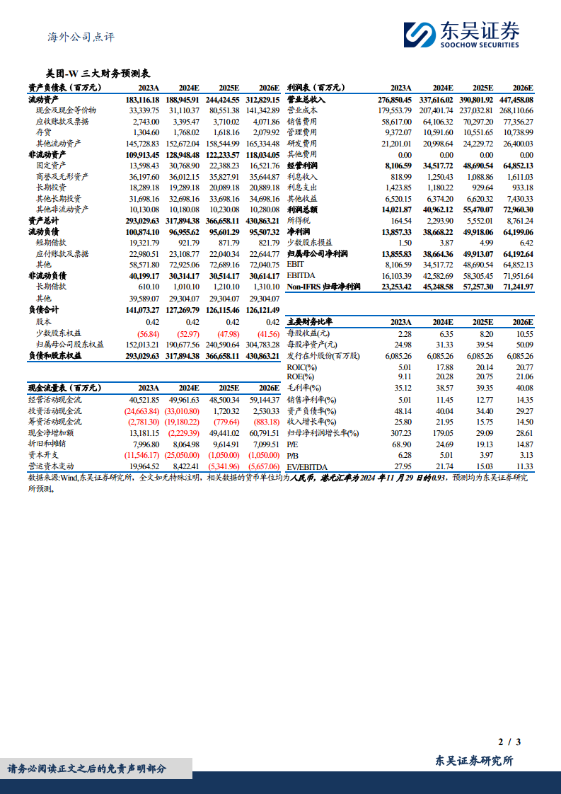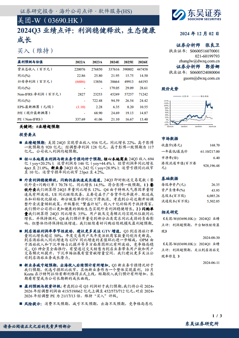 考虑到公司2024年第三季度利润表现好于预期,东吴证券将公司2024-2026年经调整利润预测由415/519/662亿元上调至452/573/712亿元。对应2024-2026年经调整PE分别为21/17/13倍。基于此,报告维持对美团-W的“买入”评级。