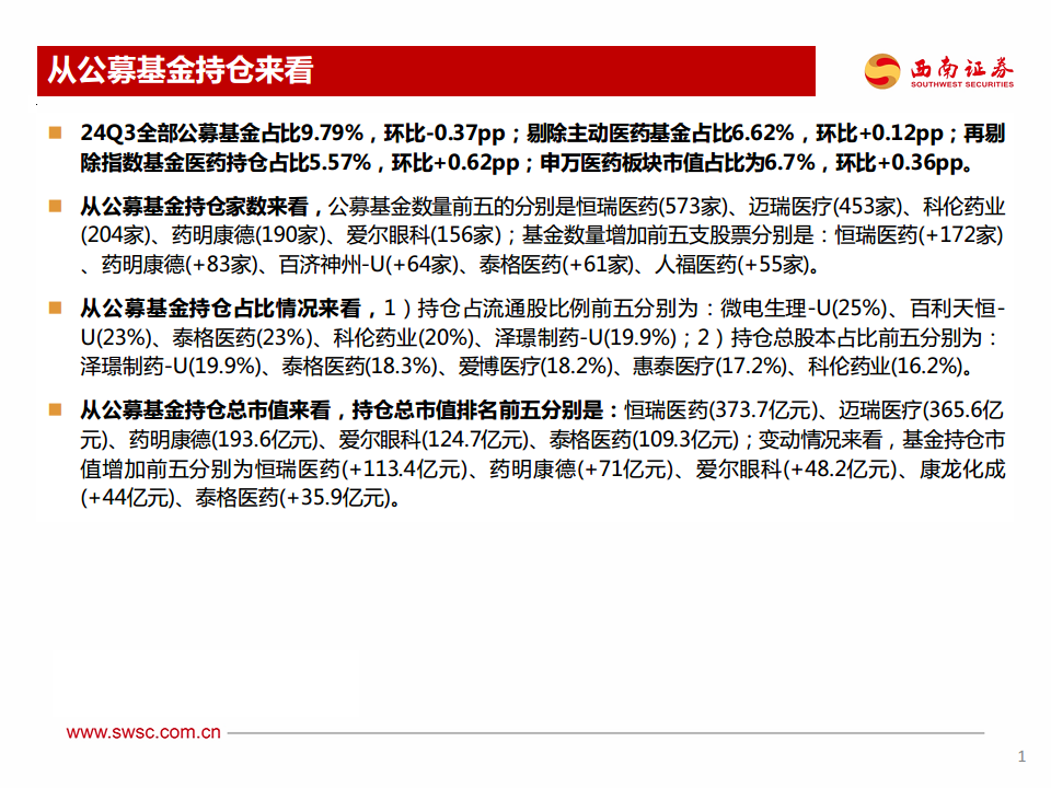 2024年第三季度,中国医药生物板块的投资格局呈现出公募基金结构性调整和陆股通资金积极增配的特点。公募基金整体持仓比例虽略有下降,但剔除主动医药基金和指数基金后的持仓占比显著回升,表明市场对医药板块的关注度并未减弱,尤其是在非专业医药基金中。恒瑞医药、药明康德、爱尔眼科等龙头企业在公募基金和陆股通资金中均获得显著增持,显示出其在市场中的核心地位和投资吸引力。子行业方面,化学制剂和医疗研发外包成为医药基金的主要增配方向,而中药和医疗设备则遭遇减持,反映出市场对创新和研发驱动型医药领域的偏好。陆股通资金的持续流入和持股总市值的增加,进一步印证了外资对中国医药市场长期发展的信心。投资者在关注整体趋势的同时,应重点关注个股基本面和子行业结构性机会,并警惕样本误差风险。