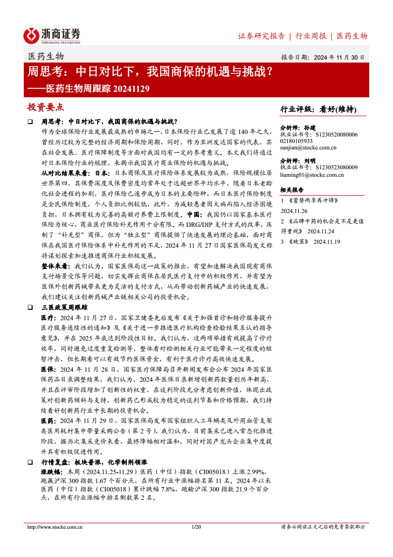 医药生物周跟踪20241129:周思考:中日对比下,我国商保的机遇与挑战?