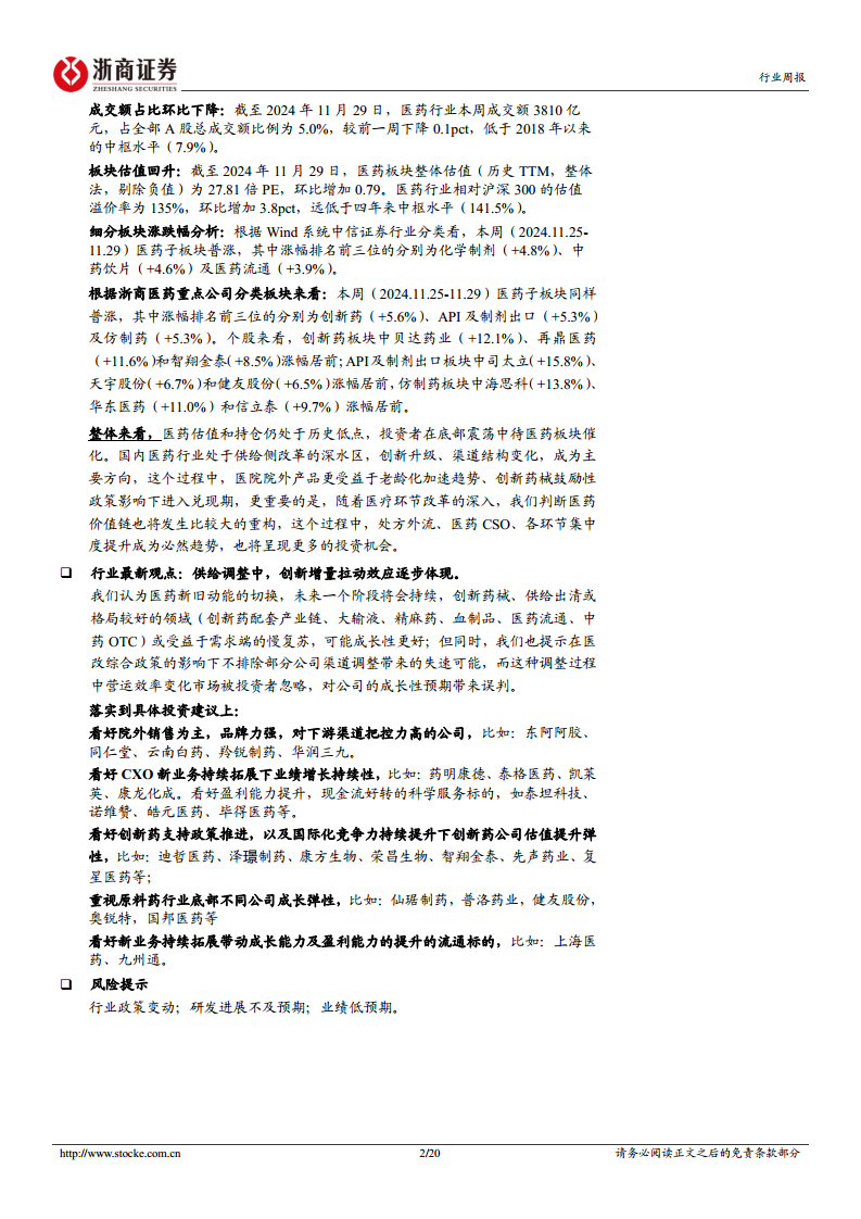 本周(2024.11.25-11.29),医药子板块呈现普涨态势。根据Wind系统中信证券行业分类,涨幅排名前三的子板块分别为化学制剂(+4.8%)、中药饮片(+4.6%)及医药流通(+3.9%)。根据浙商医药重点公司分类板块,涨幅排名前三的分别为创新药(+5.6%)、API及制剂出口(+5.3%)及仿制药(+5.3%)。个股表现方面,创新药板块中贝达药业(+12.1%)、再鼎医药(+11.6%)和智翔金泰(+8.5%)涨幅居前;API及制剂出口板块中司太立(+15.8%)、天宇股份(+6.7%)和健友股份(+6.5%)涨幅居前;仿制药板块中海思科(+13.8%)、华东医药(+11.0%)和信立泰(+9.7%)涨幅居前。
