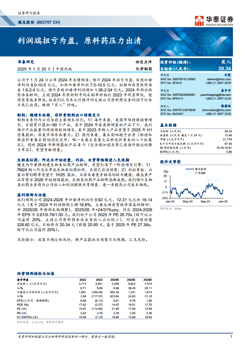 公司制剂业务持续保持稳健增长态势,海外市场(特别是美国)和国内市场均有积极进展,包括新产品密集获批和集采影响趋于出清。同时,生物类似药业务被视为公司下一阶段的重要增长引擎,阿达木单抗生物类似药已启动销售,利拉鲁肽、白蛋白紫杉醇等多个重磅产品有望在近期获批,预计将为公司带来丰厚的收入和利润增量,进一步提升公司的成长曲线。华泰研究维持“买入”评级,并基于对公司未来盈利增长的信心,给予目标价20.34元。