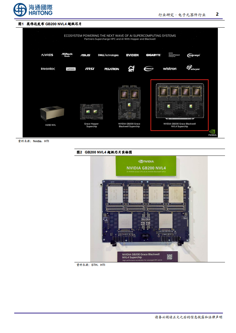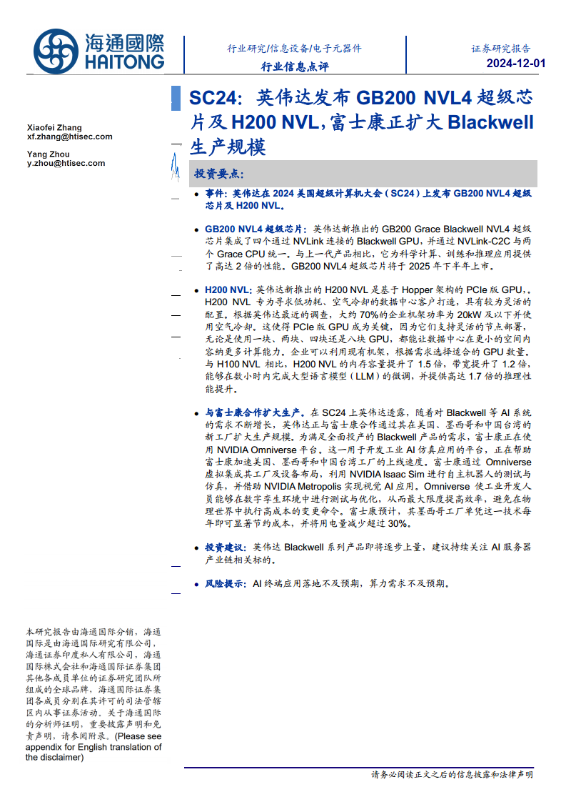 本报告分析了英伟达在2024美国超级计算机大会(SC24)上发布的新一代AI芯片GB200 NVL4和H200 NVL,强调了这些产品在性能提升和市场适应性方面的显著优势。GB200 NVL4以其强大的计算能力瞄准高端科学计算和AI训练,而H200 NVL则以其灵活配置和高效能满足了主流企业数据中心的空气冷却需求。此外,报告还详细阐述了英伟达与富士康通过NVIDIA Omniverse平台深化合作,以数字化和仿真技术扩大AI系统生产规模,显著提升生产效率和资源利用率的战略举措。鉴于Blackwell系列产品即将大规模上市,报告建议投资者关注AI服务器产业链的投资机会,并警示了AI应用落地和算力需求不及预期的潜在风险。