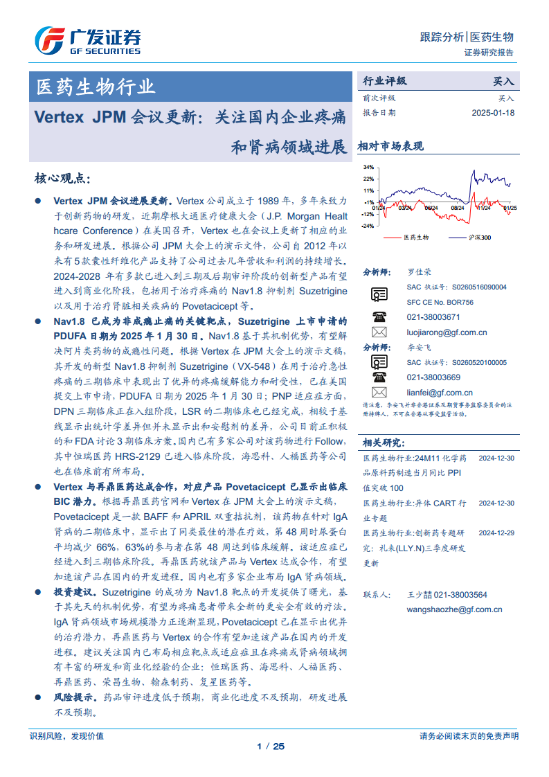 医药生物-医药生物行业:Vertex JPM会议更新:关注国内企业疼痛和肾病领域进展