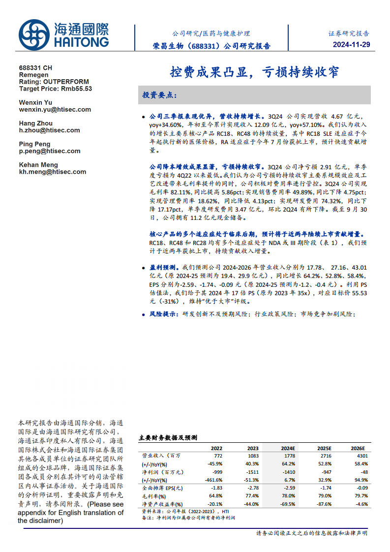 荣昌生物(688331):控费成果凸显,亏损持续收窄