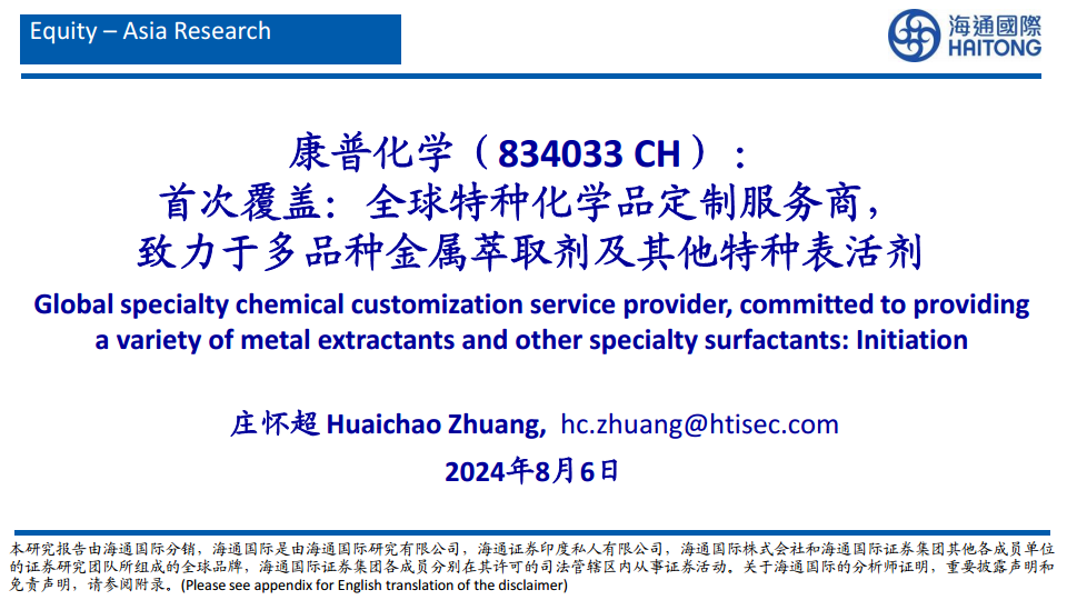 康普化学(834033):首次覆盖:全球特种化学品定制服务商,致力于多品种金属萃取剂及其他特种表活剂