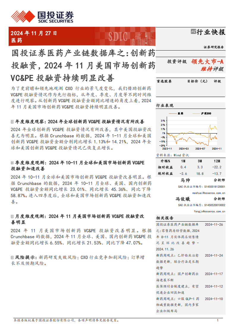 创新药VC&PE投融资的积极变化预示着CXO行业未来景气度可能提升。尽管全球和美国市场表现出强劲的复苏态势,但国内创新药VC&PE投融资仍面临同比下降的挑战。报告同时提示了新药研发失败、CXO行业竞争加剧以及订单增长不及预期等潜在风险。