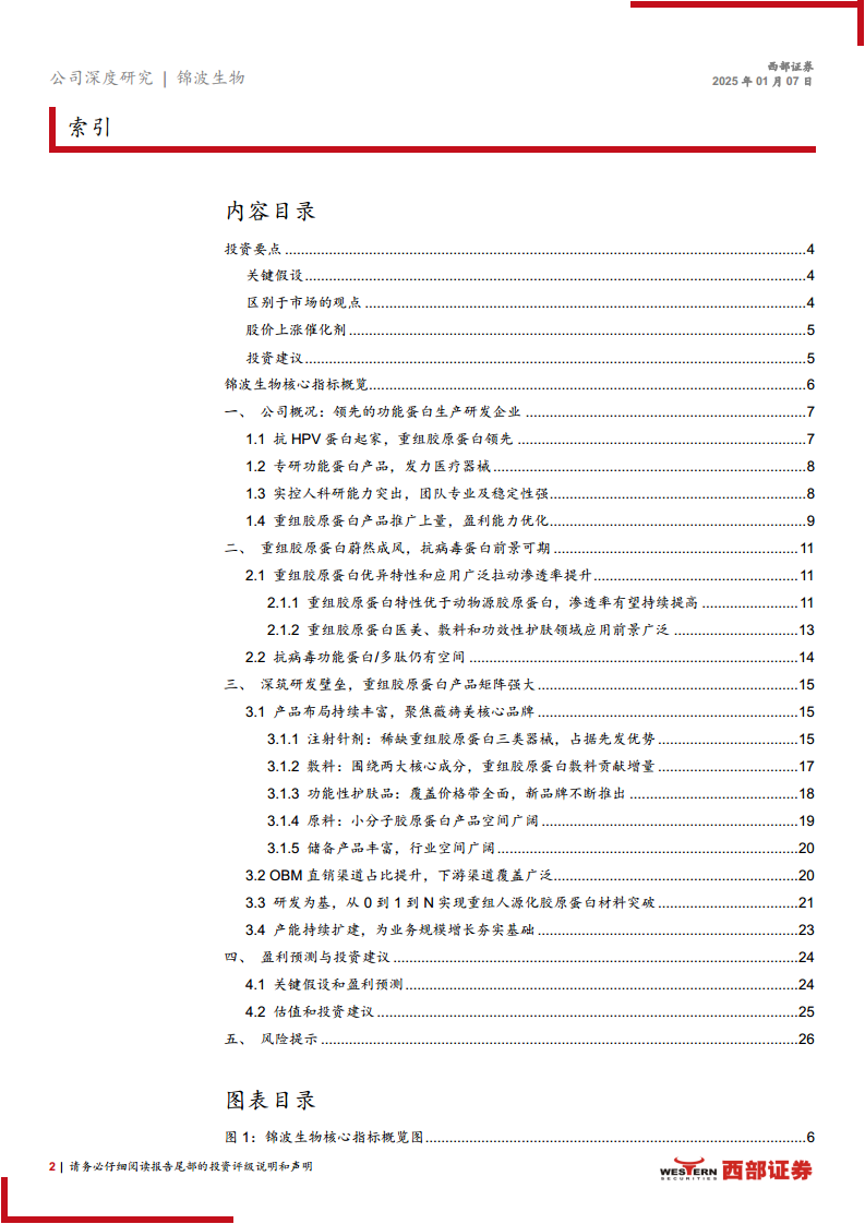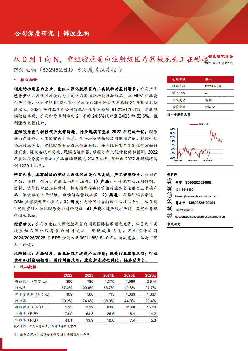 - 估值和投资建议: 报告预测公司2024/2025/2026年收入分别为13.79/19.69/25.14亿元,归母净利润分别为7.13/10.33/13.37亿元。鉴于锦波生物在重组胶原蛋白注射级医疗器械领域的先发龙头地位、高景气度行业红利以及丰富的在研管线,参考可比公司估值,首次覆盖给予“买入”评级。