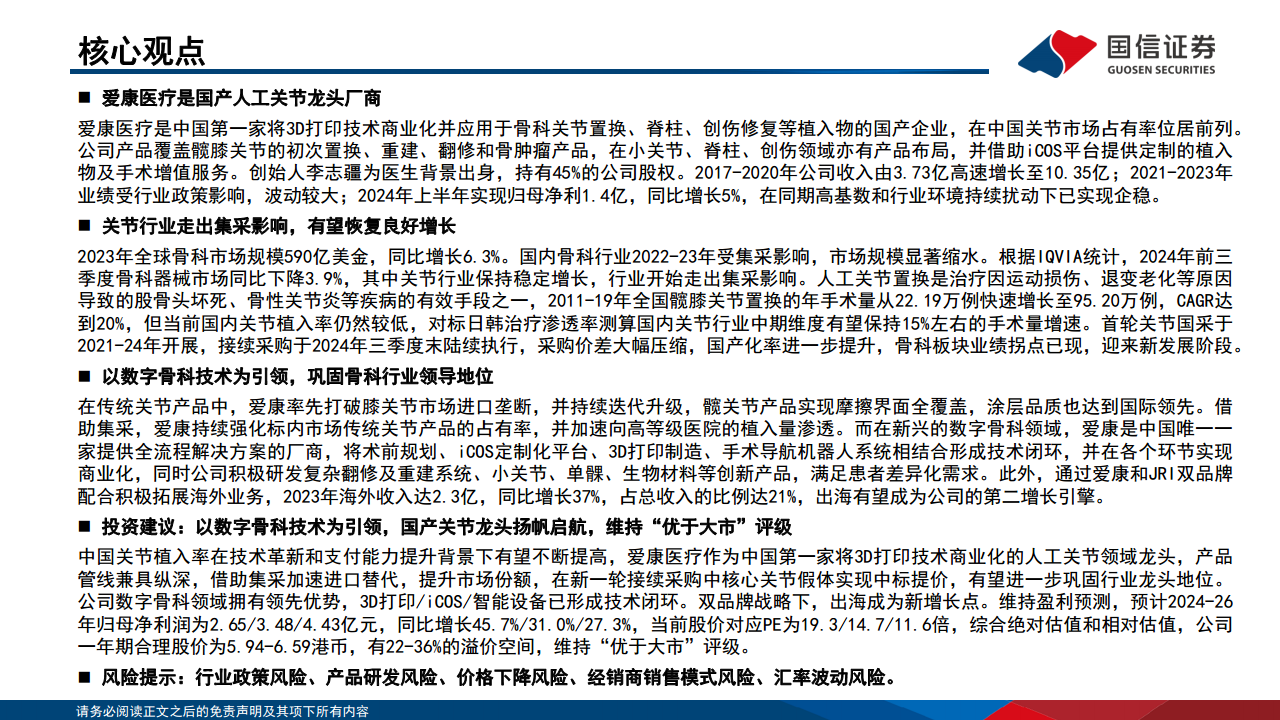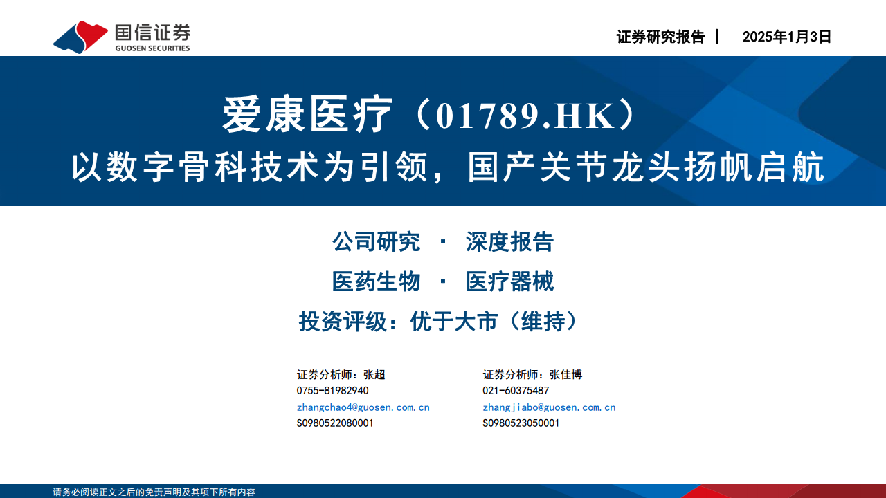 爱康医疗作为中国人工关节领域的领先企业,凭借其在3D打印技术商业化应用方面的先发优势和深厚积累,已成功巩固了国产关节龙头的市场地位。公司通过持续的产品迭代升级、全面的产品线布局以及iCOS定制化平台和智能手术机器人等数字骨科技术的引领,构建了从标准化到个性化、从传统到智能化的全流程解决方案,显著提升了其核心竞争力。在行业政策调整和市场竞争加剧的背景下,爱康医疗以技术创新为驱动,不断拓展非集采标外市场,并通过双品牌战略积极布局海外,有望在全球骨科市场中占据更重要的位置。