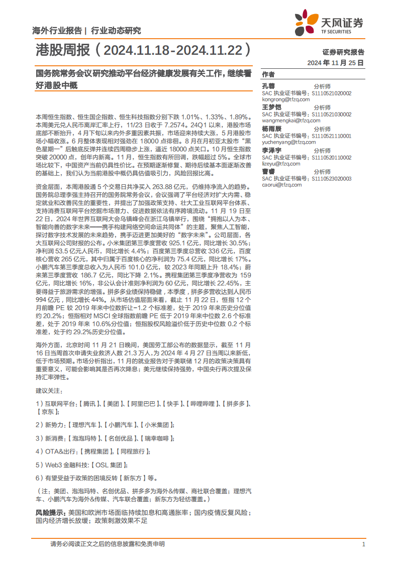 港股周报(2024.11.18-2024.11.22):国务院常务会议研究推动平台经济健康发展有关工作,继续看好港股中概