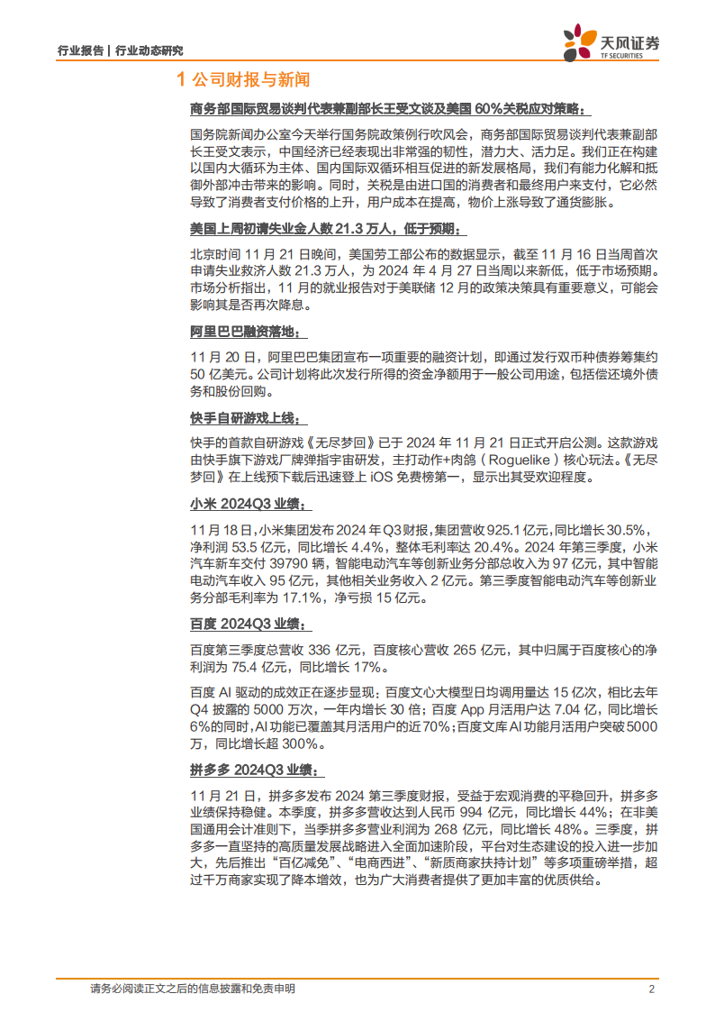 国务院常务会议研究推动平台经济健康发展有关工作,会议强调平台经济对扩大内需、稳定就业和改善民生的重要性,并提出加强政策支持、壮大工业互联网平台体系、支持消费互联网平台挖掘市场潜力、促进数据依法有序跨境流动。这表明中央层面持续支持平台经济健康发展,为相关企业提供了稳定的政策预期和广阔的发展空间。此外,2024年世界互联网大会乌镇峰会聚焦人工智能,探讨数字技术发展的未来趋势,进一步凸显了数字经济和技术创新在全球及中国发展中的战略地位。