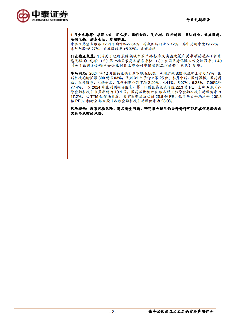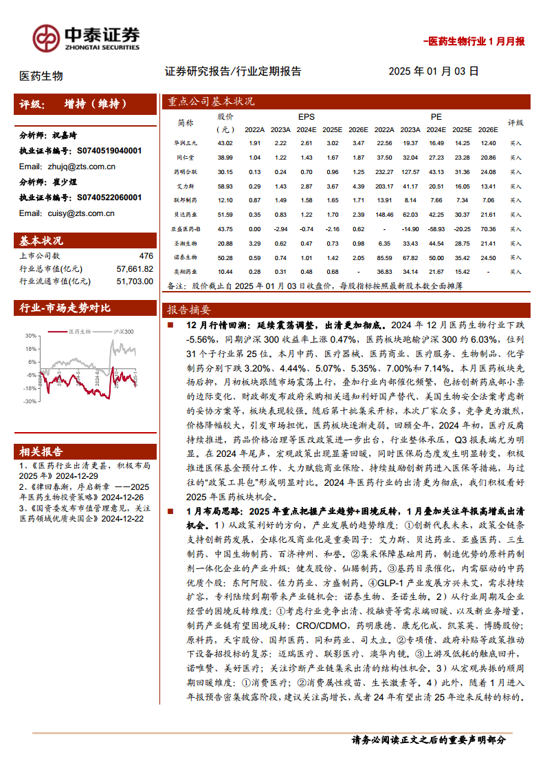 1月重点推荐公司包括:华润三九、同仁堂、药明合联、艾力斯、联邦制药、贝达药业、亚盛医药、圣湘生物、诺泰生物、奥翔药业。