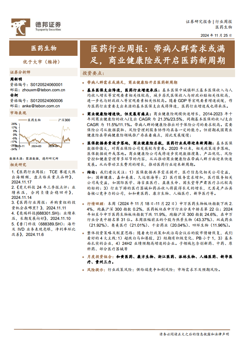 医药行业周报:带病人群需求或满足,商业健康险或开启医药新周期