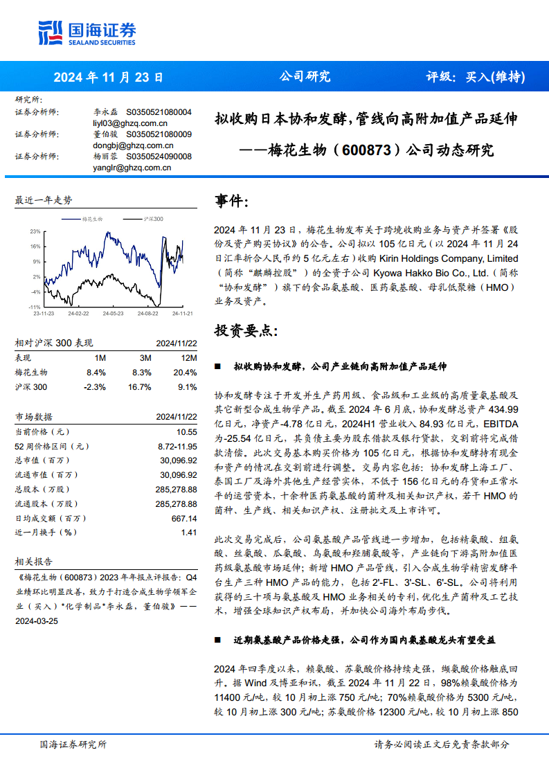 梅花生物于2024年11月23日发布公告,拟以105亿日元(约合人民币5亿元)收购麒麟控股旗下协和发酵的食品氨基酸、医药氨基酸及HMO业务与资产。协和发酵专注于高质量氨基酸及新型合成生物学产品的开发与生产,截至2024年6月底,其总资产为434.99亿日元,2024年上半年营业收入为84.93亿日元。