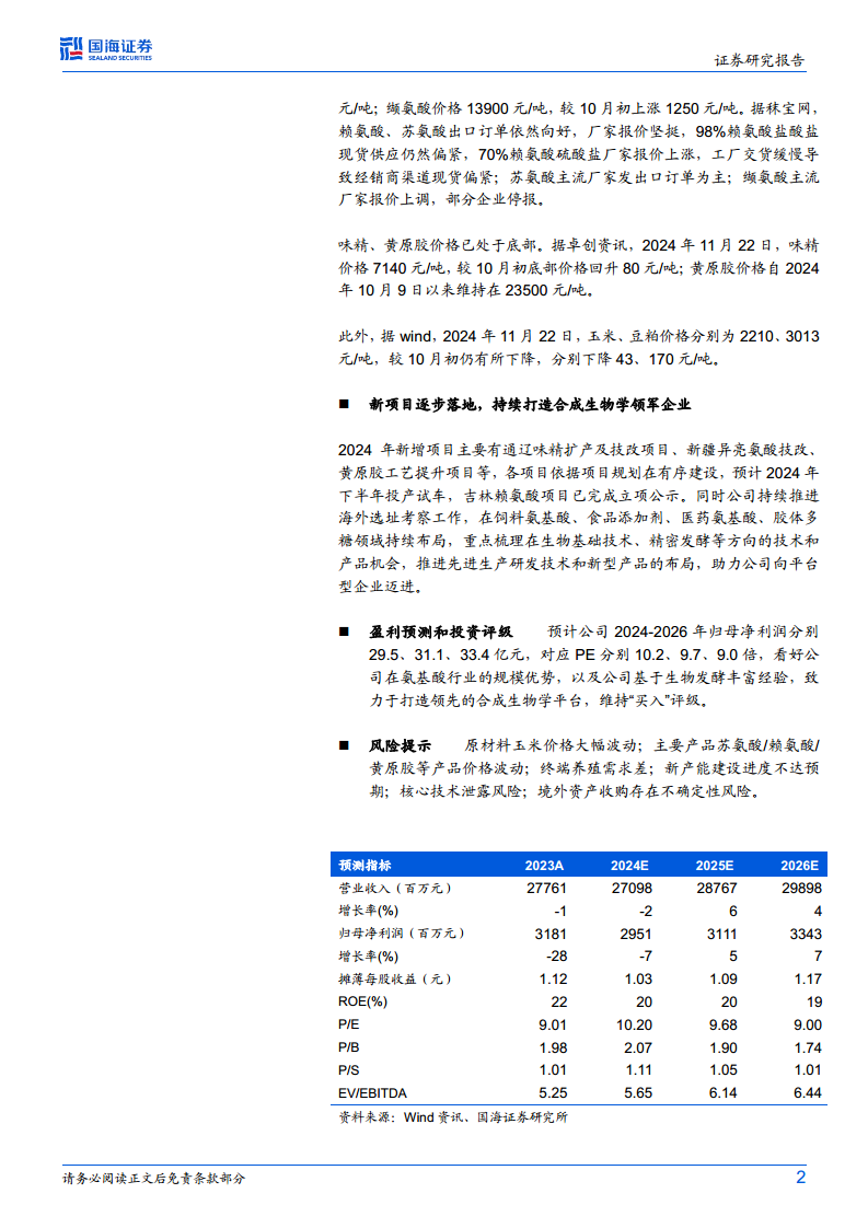 报告提示了多项风险,包括原材料玉米价格大幅波动、主要产品(如苏氨酸、赖氨酸、黄原胶)价格波动、终端养殖需求不佳、新产能建设进度不达预期、核心技术泄露风险以及境外资产收购存在不确定性风险。