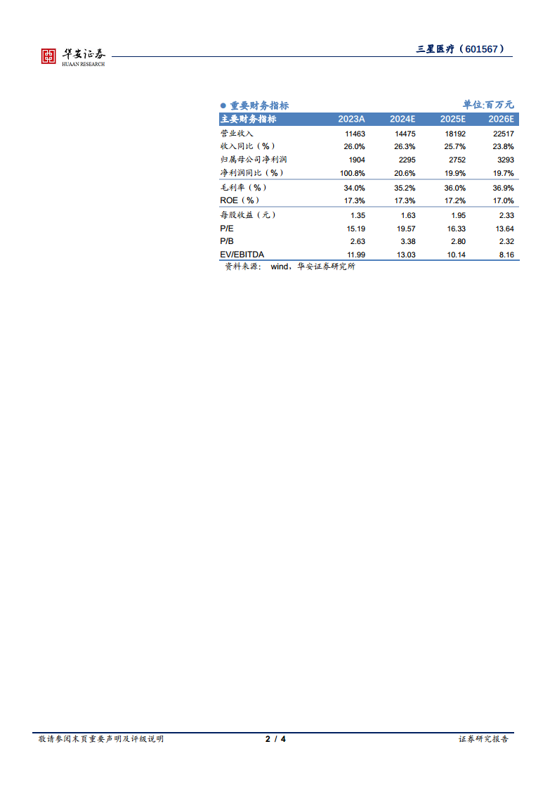 分析师预计三星医疗在康复医疗和智能配用电双轮驱动下,业绩将持续增长。预测公司2024年至2026年将分别实现营业收入144.75亿元、181.92亿元和225.17亿元,同比增速分别为26.3%、25.7%和23.8%。同期,归属于母公司股东的净利润预计分别为22.95亿元、27.52亿元和32.93亿元,同比增速分别为20.6%、19.9%和19.7%。基于此,分析师维持对三星医疗的“买入”评级。